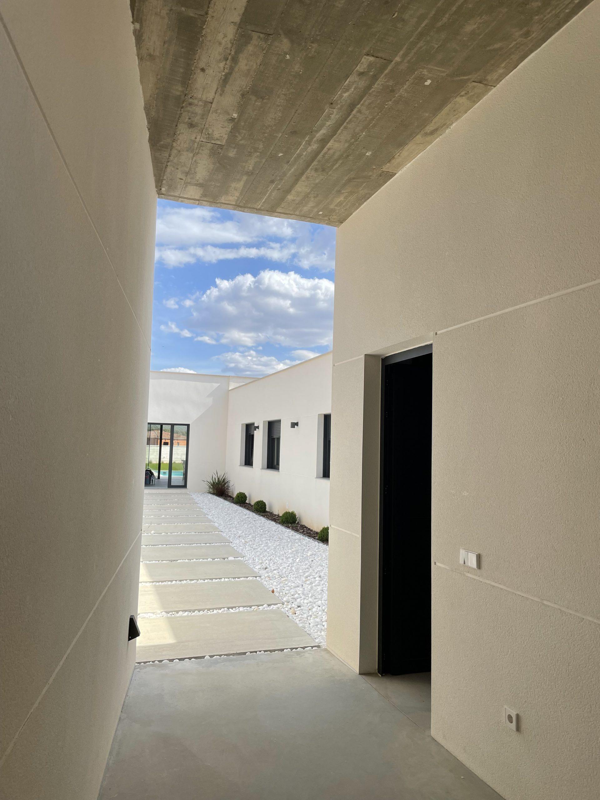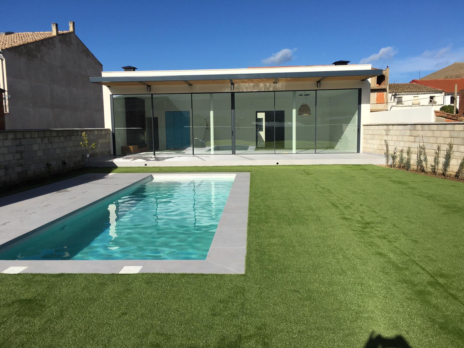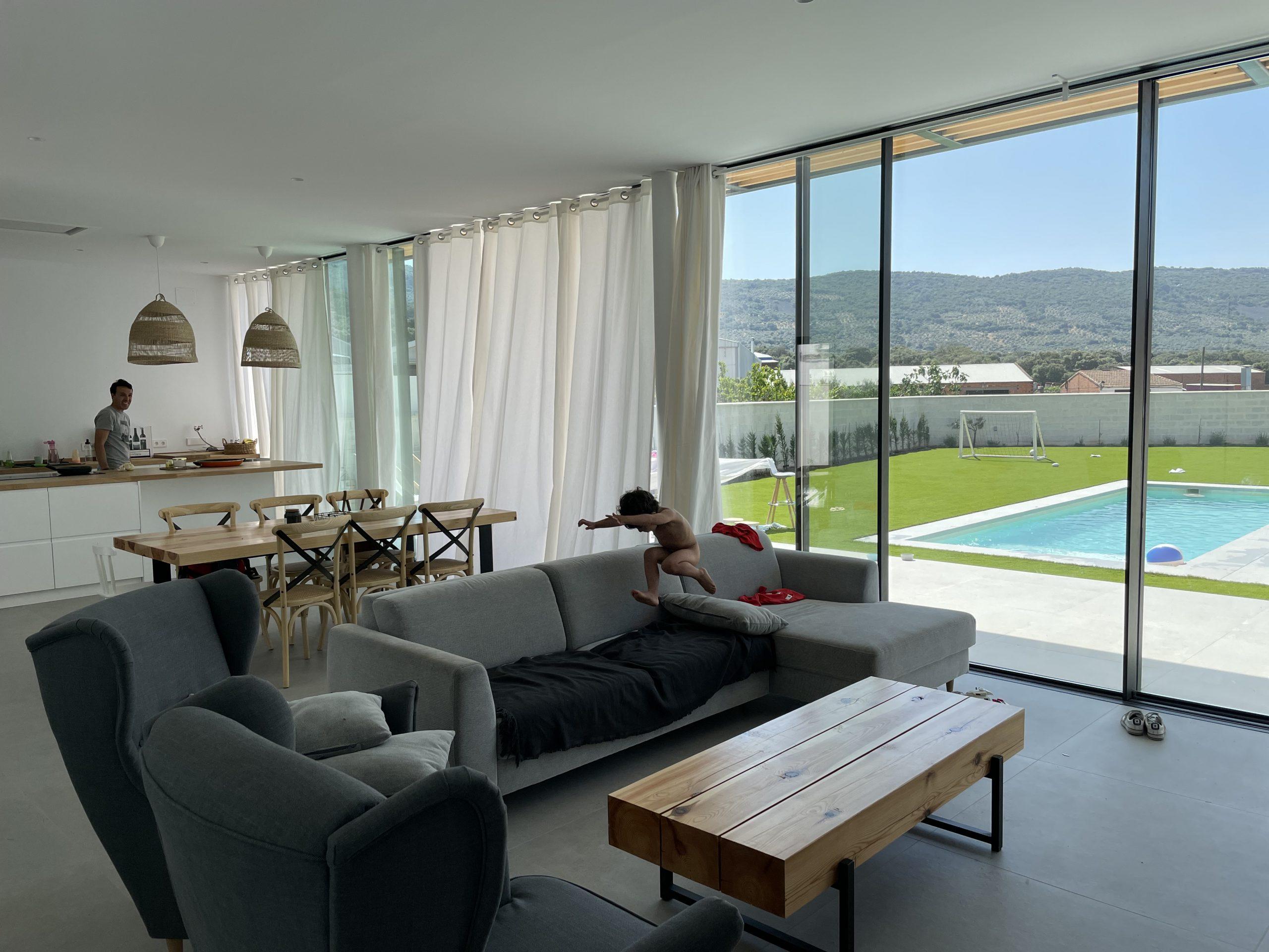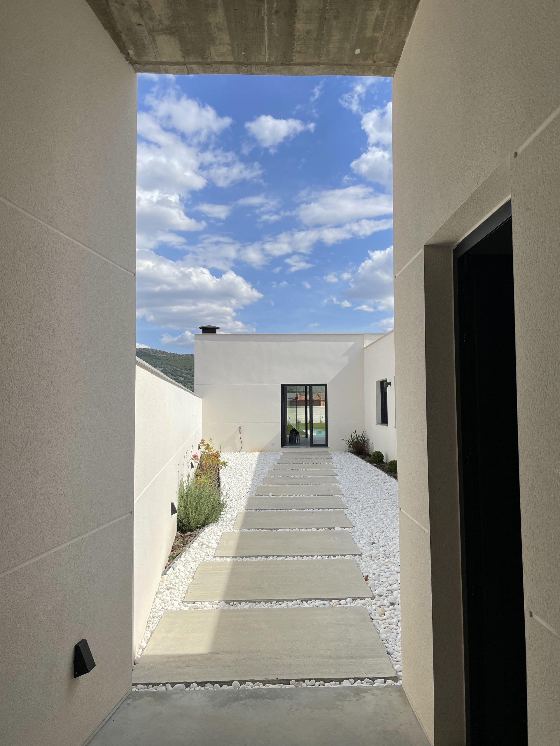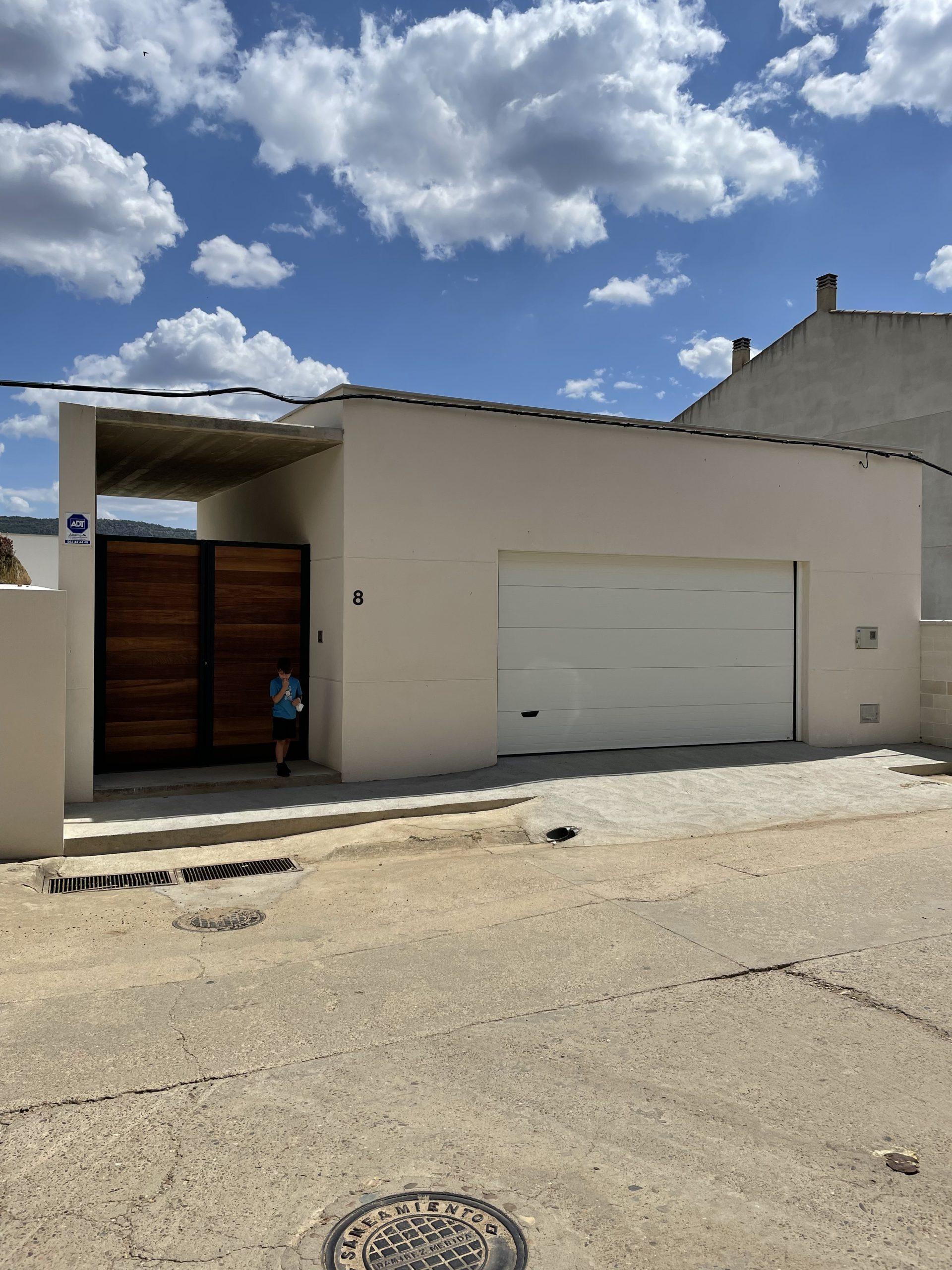 Es una vivienda en una sola planta que consta de 3 volúmenes que forman una U. Cada volumen tiene un uso diferenciado. El primer volumen que da a la calle es el garaje. La entrada peatonal está entre el volumen garaje y la medianera este y nos conduce a un patio interior que recorre paralelo al segundo volumen que es el de dormitorios. Al final del patio tenemos el tercer volumen que es el de la zona de día, cocina-comedor-salón, en una sola estancia con un ventanal que mira al sur y al jardín con la piscina. Tiene una gran pérgola al sur que protege el ventanal de los rayos del sol.