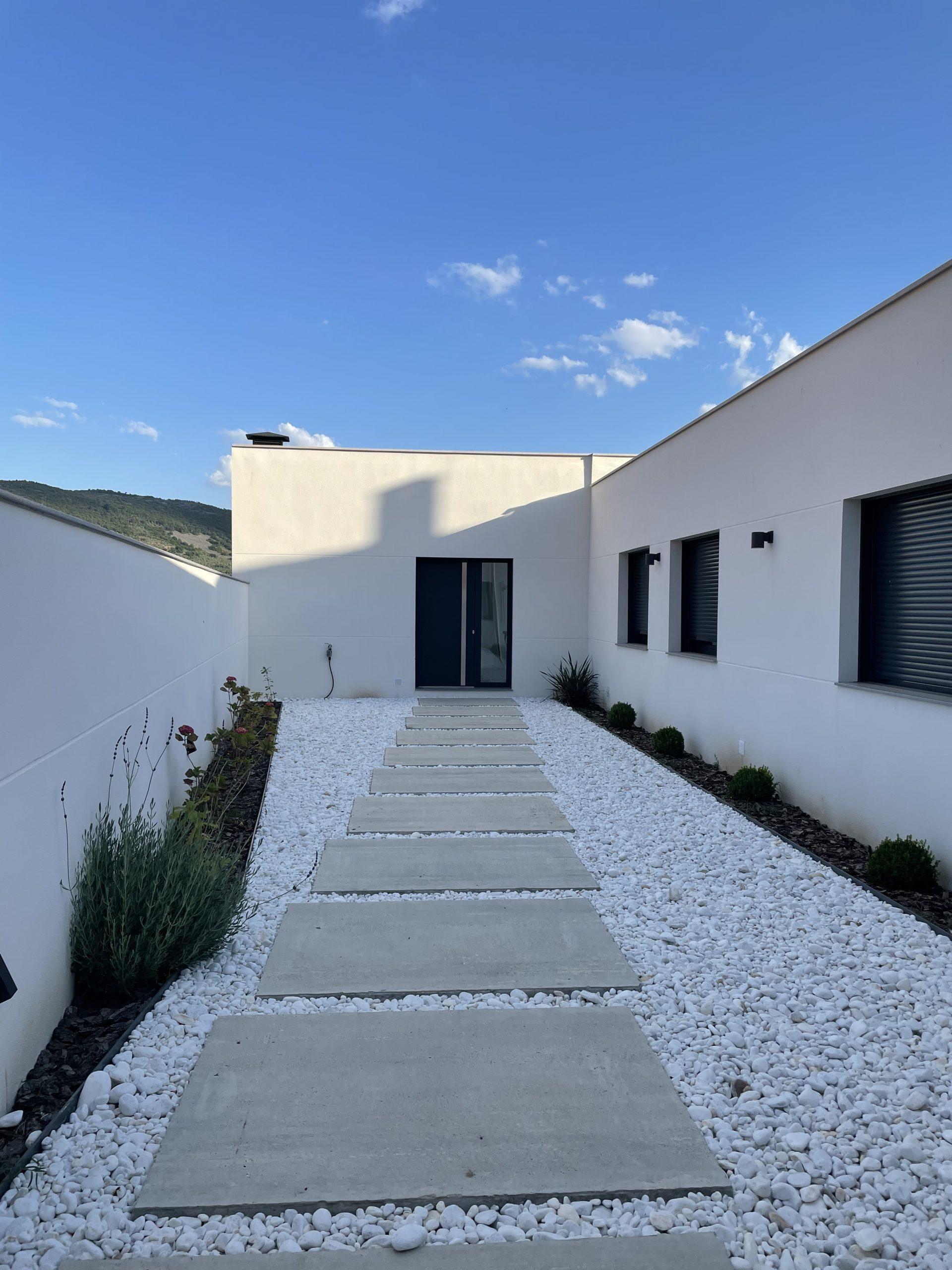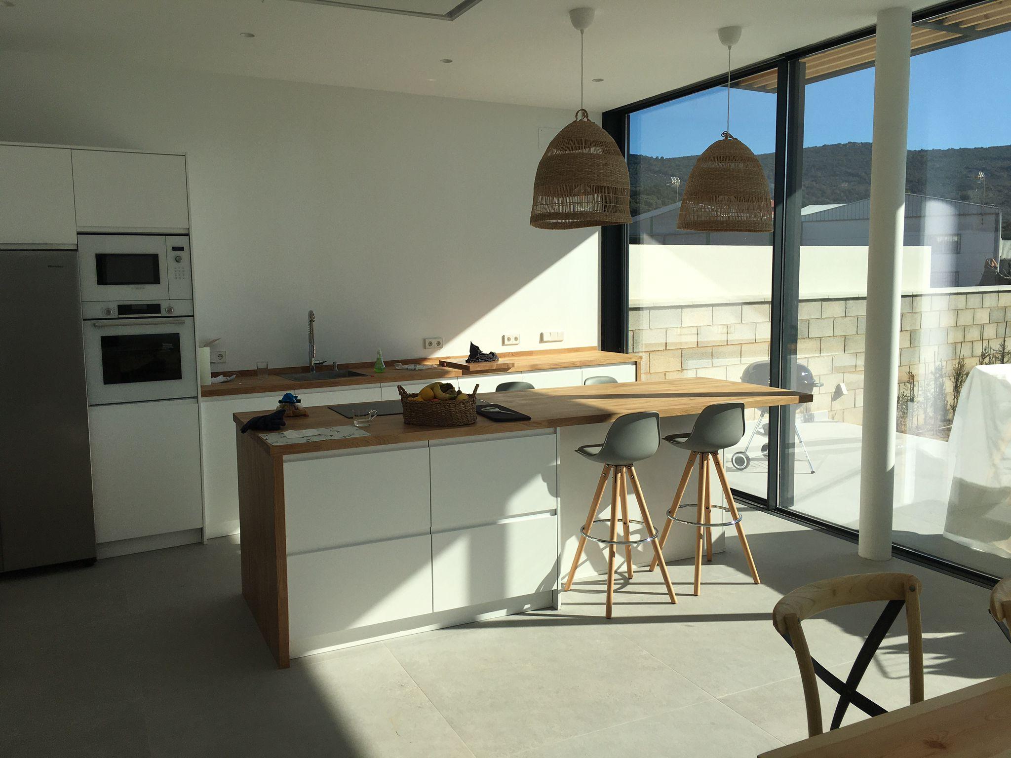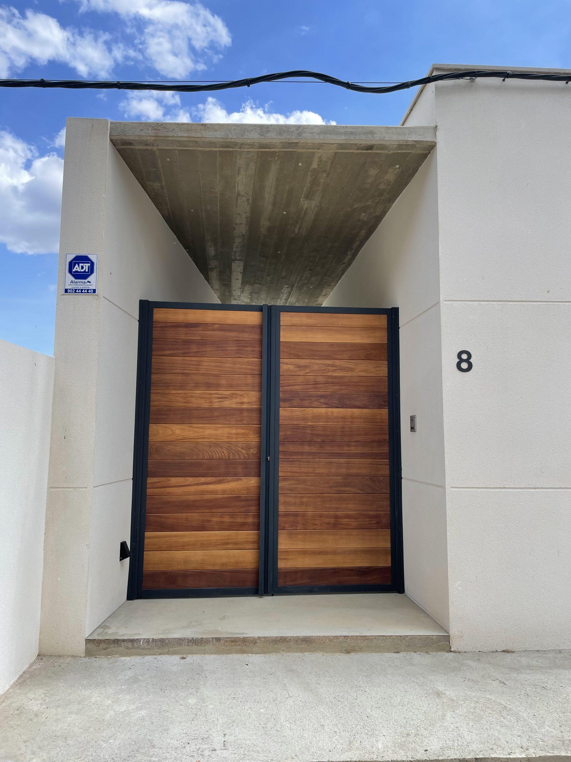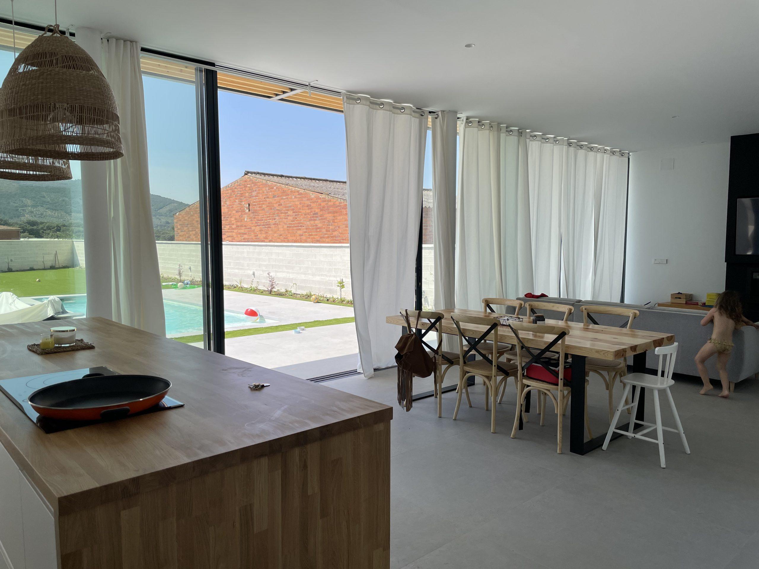 Es una vivienda en una sola planta que consta de 3 volúmenes que forman una U. Cada volumen tiene un uso diferenciado. El primer volumen que da a la calle es el garaje. La entrada peatonal está entre el volumen garaje y la medianera este y nos conduce a un patio interior que recorre paralelo al segundo volumen que es el de dormitorios. Al final del patio tenemos el tercer volumen que es el de la zona de día, cocina-comedor-salón, en una sola estancia con un ventanal que mira al sur y al jardín con la piscina. Tiene una gran pérgola al sur que protege el ventanal de los rayos del sol.