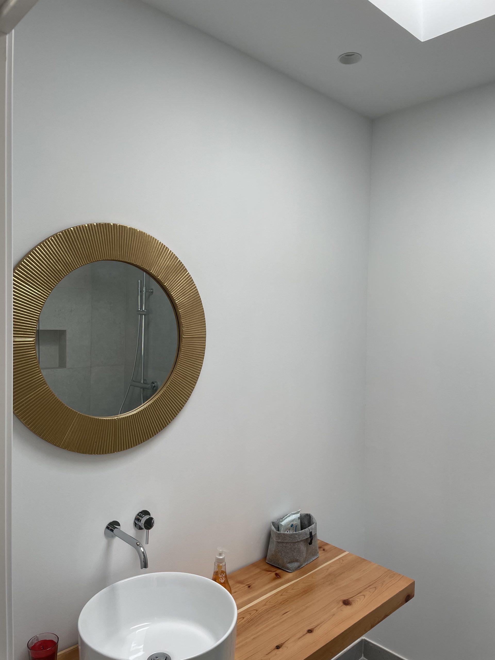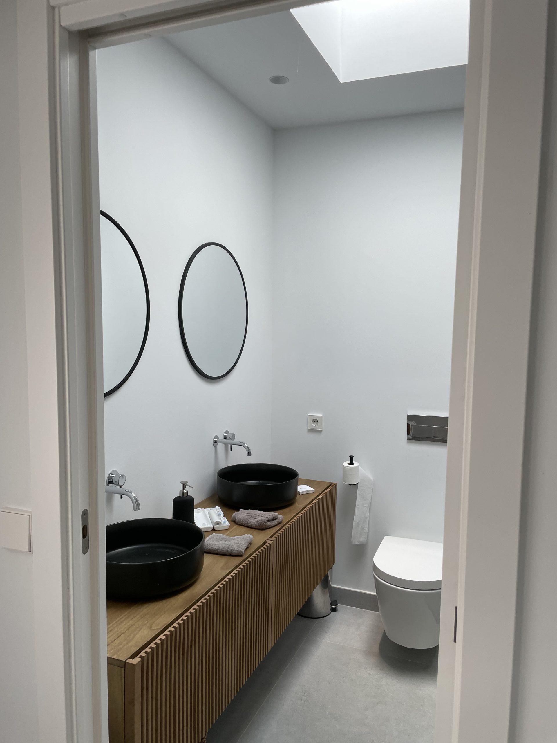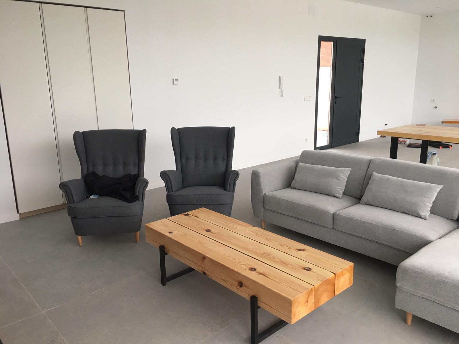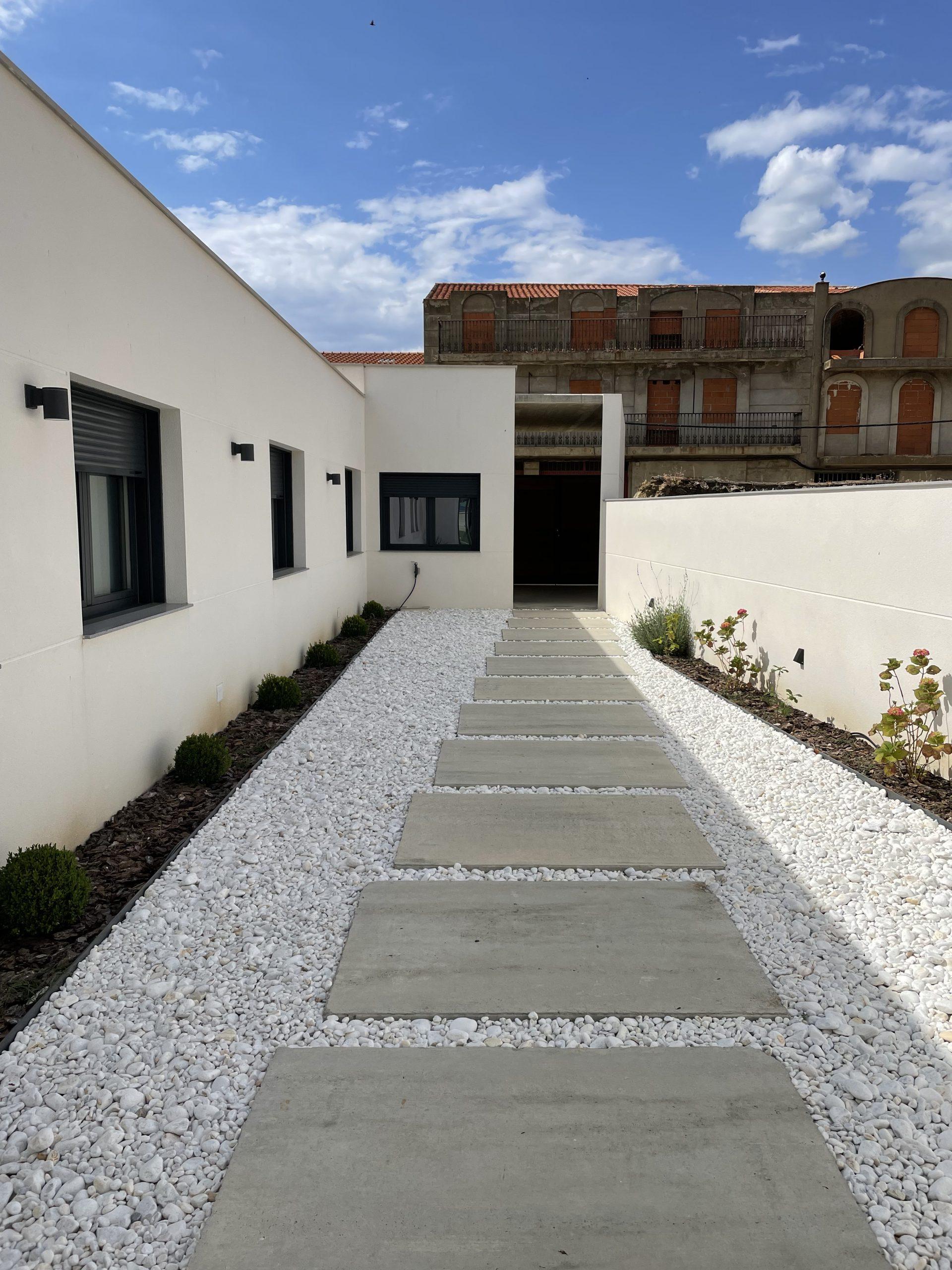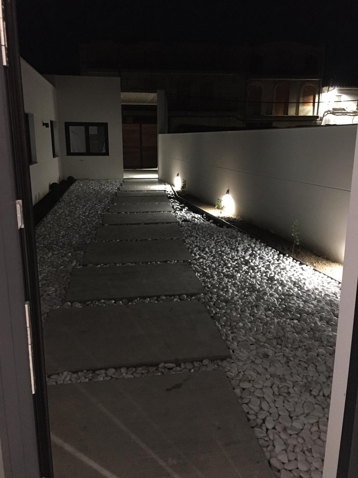 Es una vivienda en una sola planta que consta de 3 volúmenes que forman una U. Cada volumen tiene un uso diferenciado. El primer volumen que da a la calle es el garaje. La entrada peatonal está entre el volumen garaje y la medianera este y nos conduce a un patio interior que recorre paralelo al segundo volumen que es el de dormitorios. Al final del patio tenemos el tercer volumen que es el de la zona de día, cocina-comedor-salón, en una sola estancia con un ventanal que mira al sur y al jardín con la piscina. Tiene una gran pérgola al sur que protege el ventanal de los rayos del sol.